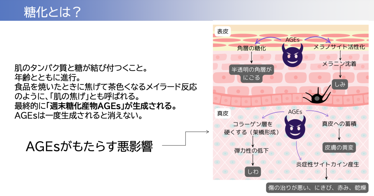 シワ・たるみ・シミ・くすみなど、加齢に伴う肌悩みの原因には紫外線や乾燥によるもの、生活習慣などさまざまなものが考えられますが、その一つに糖化があるのです。